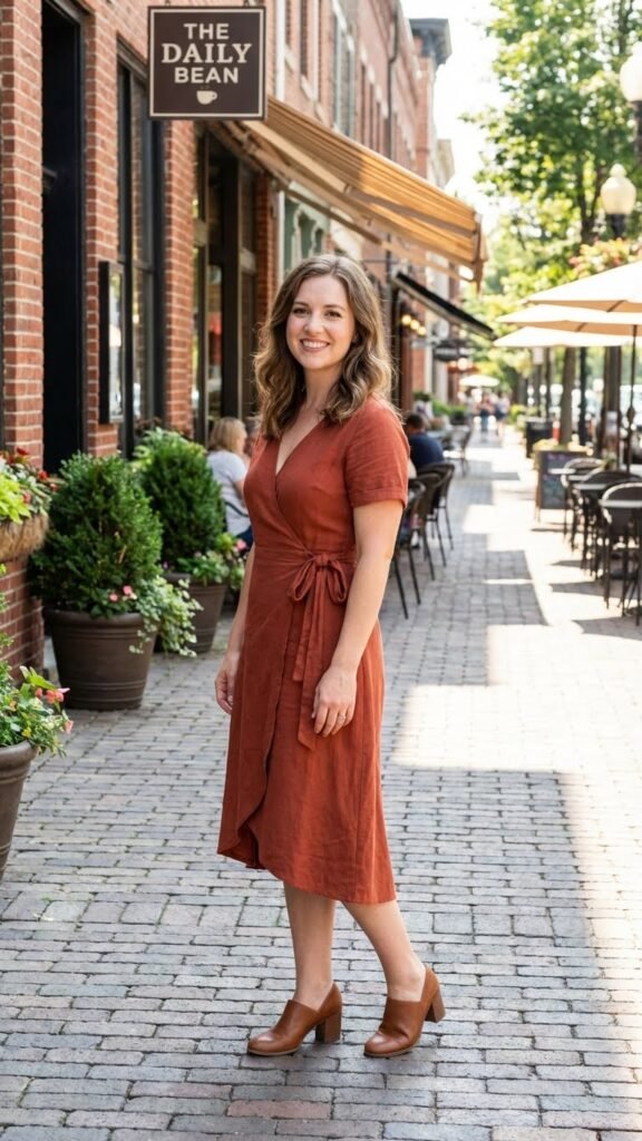 Choose a floral print for spring dates or a solid rich color like rust or navy for fall and winter. Block heels keep you comfortable if there’s walking involved, and a structured handbag elevates the whole thing. This is the outfit equivalent of a warm hug that also happens to look incredible.
