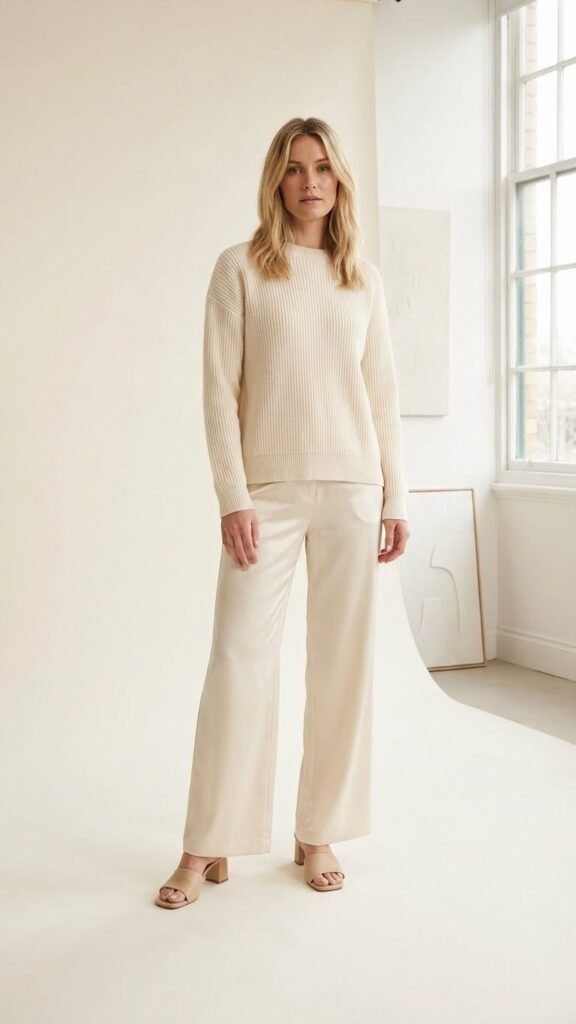 All black is the easiest to pull off, but don’t sleep on all cream, all burgundy, or all chocolate brown. Mix textures within the same color family to keep it interesting. Satin pants with a cashmere top in the same ivory shade? Absolutely stunning. This trick makes getting dressed so much easier once you embrace it.