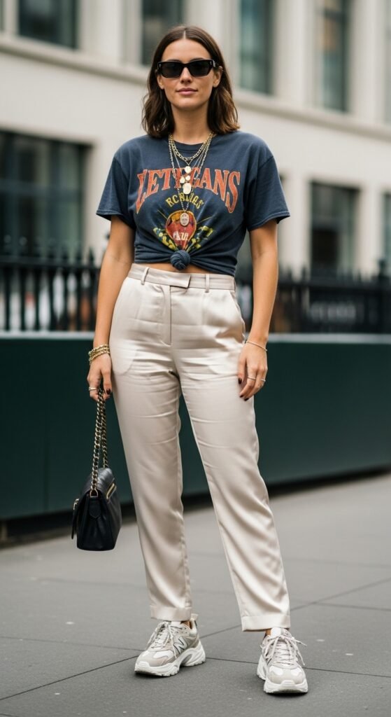 Who says satin trousers have to be dressy? Throwing on a vintage band tee or a fun graphic top instantly brings these fancy pants down to earth in the best way. The contrast between casual and luxe is what makes this combination so interesting.