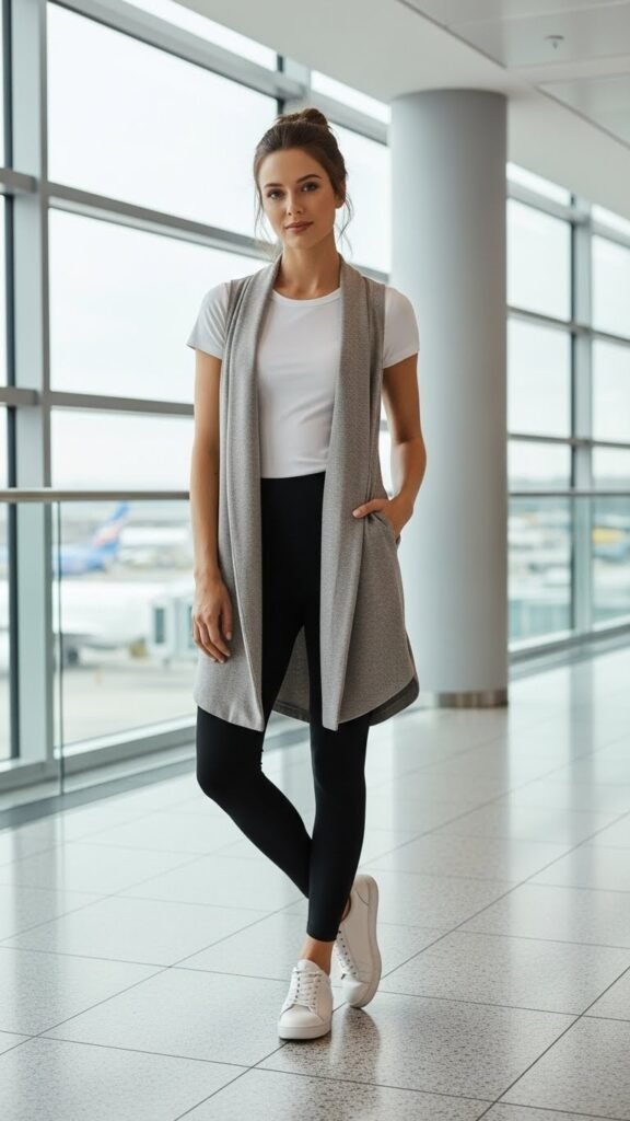 Add some trendy sneakers and a baseball cap if you’re going for that cool-girl-off-duty vibe. This look is perfect for those early morning flights when you need maximum comfort but still want to feel cute. The cardigan also doubles as a blanket on cold flights, which is honestly genius.