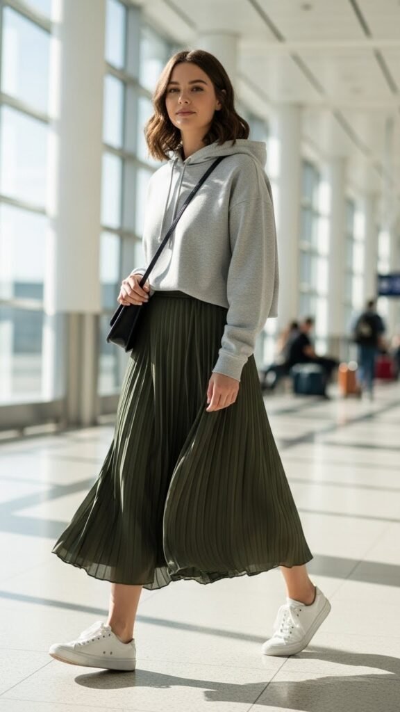 The trick here is keeping everything else minimal. Let the unexpected pairing do the talking. This outfit gives off serious “I’m stylish but don’t take myself too seriously” energy, which is exactly the vibe you want at the airport. Plus, the skirt offers way more breathability than pants on long flights.