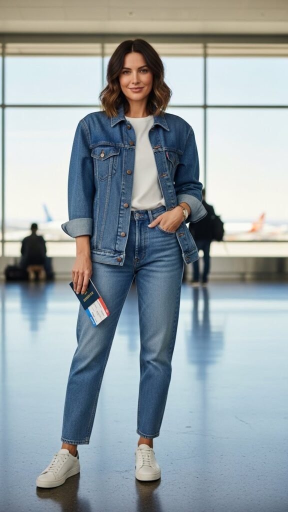 Style with ankle boots or sleek sneakers. This look is incredibly practical because denim is durable and looks better slightly lived-in (perfect for travel days). Add a leather tote bag and some simple jewelry, and you’ve got an outfit that looks effortlessly cool without trying too hard.