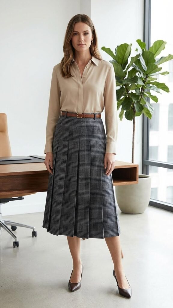 Plaid skirts bring timeless sophistication to your office wardrobe, especially when you balance their pattern with a solid color blouse that creates visual harmony. Choose colors from within the plaid’s palette for seamless coordination—navy blouse with navy-green tartan or cream top with brown-beige checks.