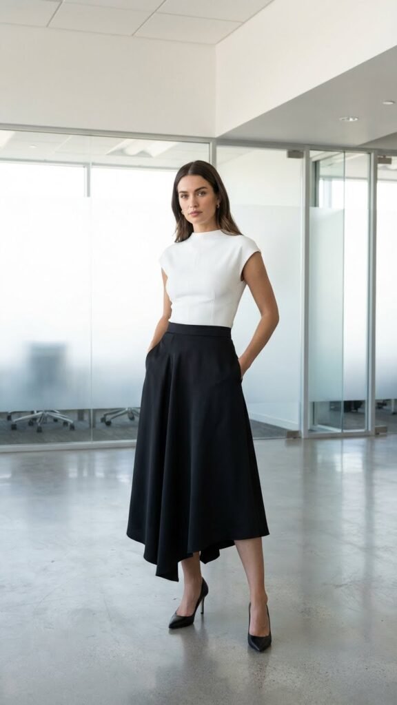 A monochromatic pairing amplifies sophistication – try navy pieces or classic black combinations for maximum impact. Select structured blazers or fitted button-downs to complement the skirt’s unique hemline. This combination lets you express creativity while meeting dress code requirements, proving you can adopt individuality without sacrificing workplace standards.