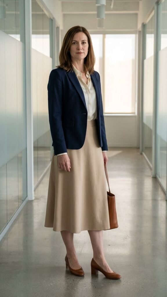 While pencil skirts offer a sleek silhouette, an A-line midi skirt paired with a customized blazer delivers comfortable sophistication that’s perfect for long workdays. This combination creates a sophisticated silhouette without restricting your movement during meetings or presentations.