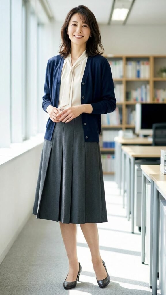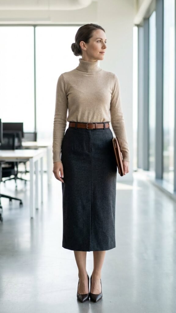 Choose fitted sweaters in merino wool or cashmere blends that won’t add bulk when tucked. Pencil skirts work beautifully, but A-line styles provide more movement freedom. Try color blocking by pairing navy sweaters with burgundy skirts or cream tops with charcoal bottoms. These tailored pieces embody the timeless elegance that defines sophisticated office attire.