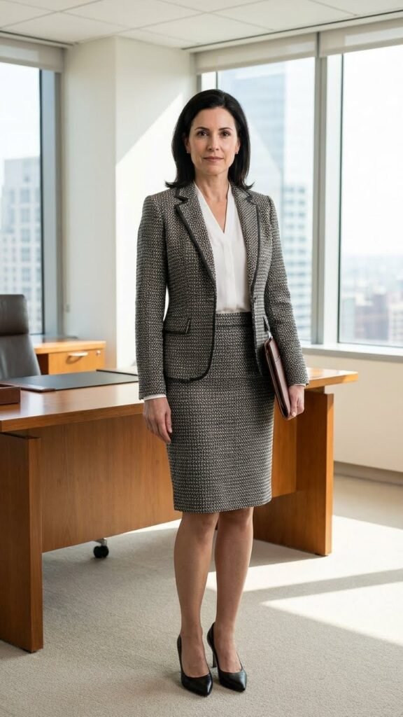 Why settle for separates when a tweed skirt and matching blazer set delivers timeless elegance with zero guesswork? You’ll command respect while maintaining feminine sophistication in this classic combination that works across industries and seasons.