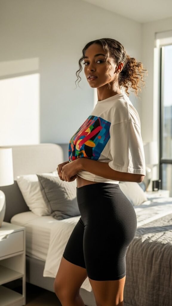 A vintage or band tee paired with cute sleep shorts is effortlessly cool without trying too hard. This combo is casual, comfortable, and gives off major chill girl energy. It’s the outfit equivalent of saying “I woke up like this” and actually meaning it.