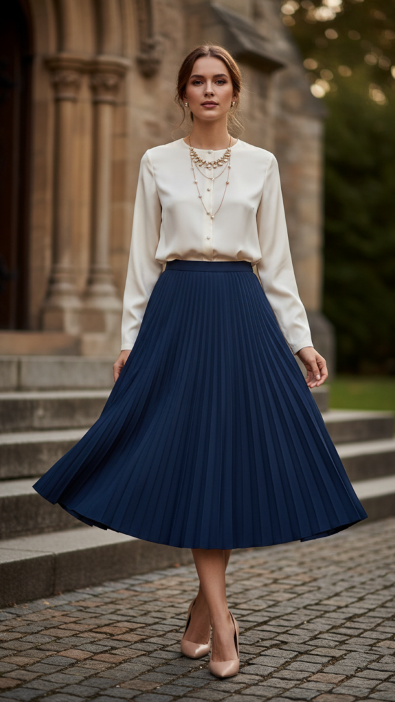 For a sophisticated alternative to dresses, pair a midi skirt with a silk blouse to create an ensemble that’s both polished and comfortable for Sunday worship. Choose a pleated or A-line midi in navy, burgundy, or classic black for timeless appeal.