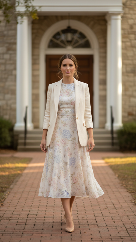 Although floral sundresses capture the essence of Southern charm, adding a customized blazer alters this casual piece into church-appropriate attire that’s both feminine and refined. You’ll create sophisticated Sunday style by layering a structured blazer over delicate florals. Choose navy, cream, or soft pastels that complement your dress’s pattern without overwhelming it.