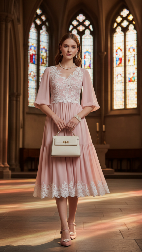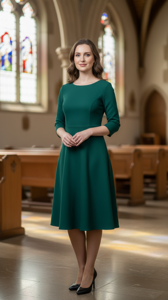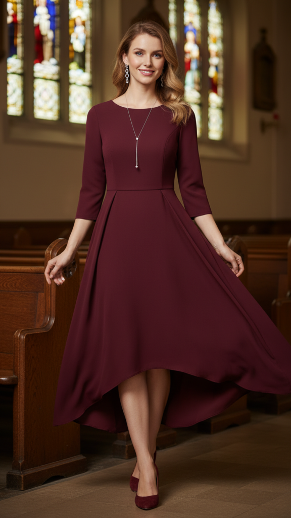 Pair your high-low dress with closed-toe pumps and delicate jewelry. Navy, burgundy, or forest green work beautifully for this silhouette. You’ll feel confident knowing your outfit honors both fashion-forward thinking and time-honored church etiquette perfectly.