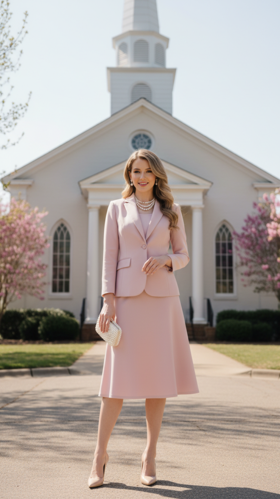 A monochromatic pastel palette in powder blue, sage green, or blush pink offers versatility and refinement. Pair your suit with nude pumps and pearl accessories for classic appeal. The structured blazer provides professional polish, while the skirt length should hit at or below the knee. These stylish church looks are specially curated to highlight your natural beauty and confidence. This ensemble respects church traditions while expressing your individual taste through color choice and styling details.