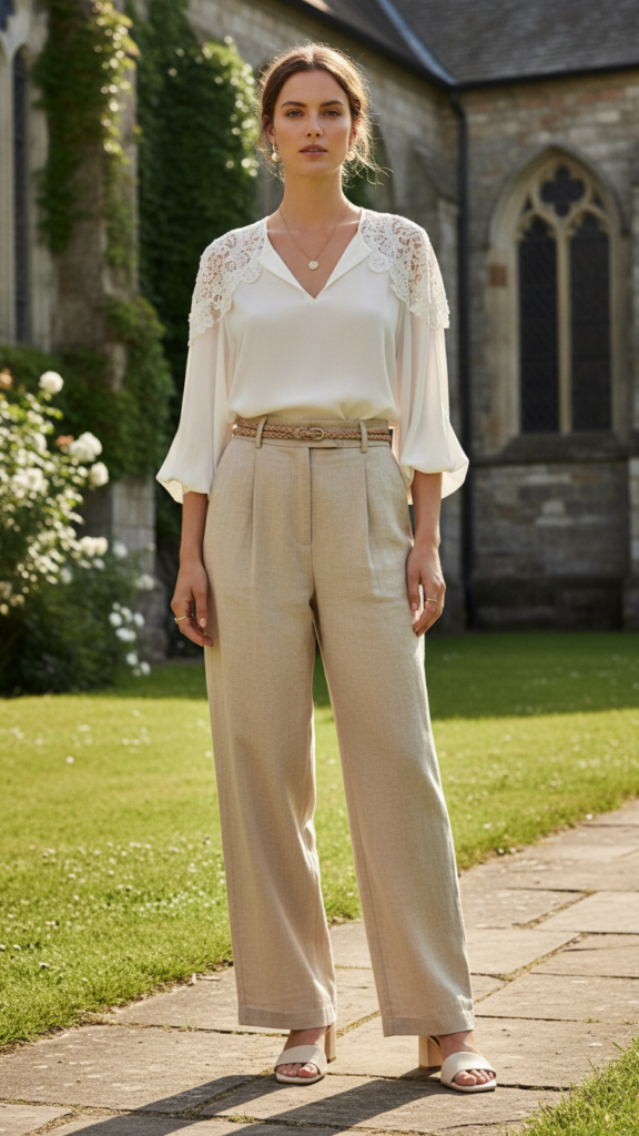 Linen pants paired with a feminine blouse create an effortlessly graceful combination that’s both comfortable and appropriate for Southern church services.