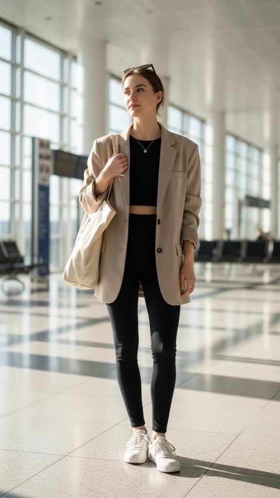 The blazer gives you structure and warmth without being bulky, plus the pockets are clutch for boarding passes and lip balm. Go for a neutral like beige, gray, or even a soft spring color like sage green. Throw on white sneakers or sleek slip-on mules, and you’re golden. This outfit works because it’s stretchy where it needs to be and polished everywhere else.