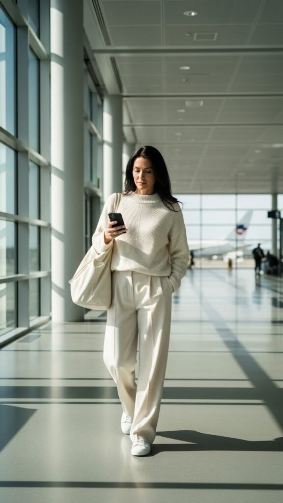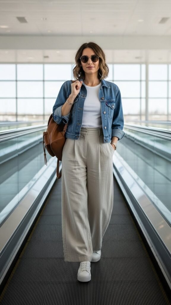 Add a cropped jacket or cardigan for layering, and slide into platform sandals or sleek sneakers. This outfit gives major “I’m traveling to somewhere fabulous” energy while still being practical. Wide-leg pants also pack surprisingly well and don’t show wrinkles as much as other styles. Functional fashion at its finest.
