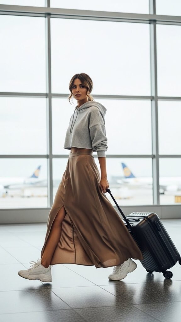 The best part? Ultimate comfort for those long security lines and cramped seats, but you still look like you tried. Add a cropped puffer vest or denim jacket on top for layering, slide into some fresh white sneakers, and grab your favorite tote. This outfit screams “I travel in style but also value my sanity.”
