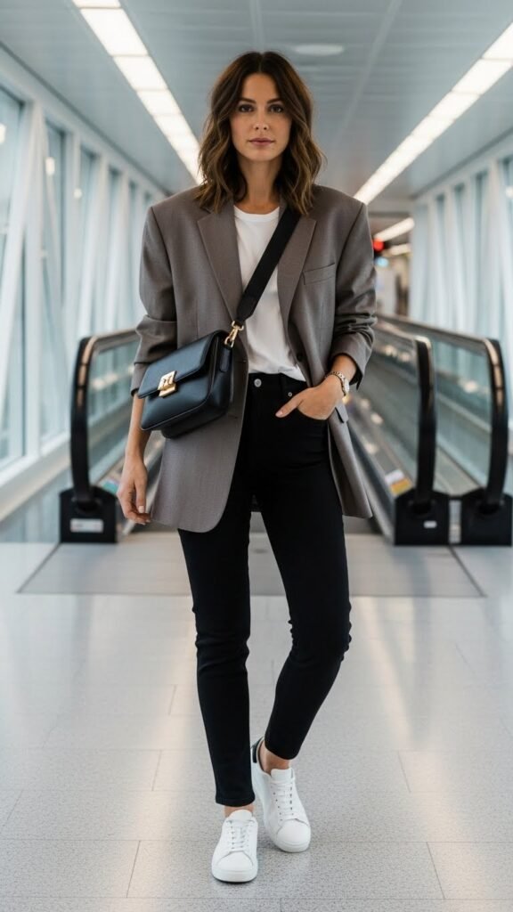 Ankle boots or sleek sneakers work equally well here. Keep a crossbody bag for hands-free airport navigation because trying to look cute while wrestling with a tote, coffee, and boarding pass? Not the vibe. This look is polished enough for a work trip but comfortable enough that you could sleep in it if needed. Not that I’ve done that. Multiple times.