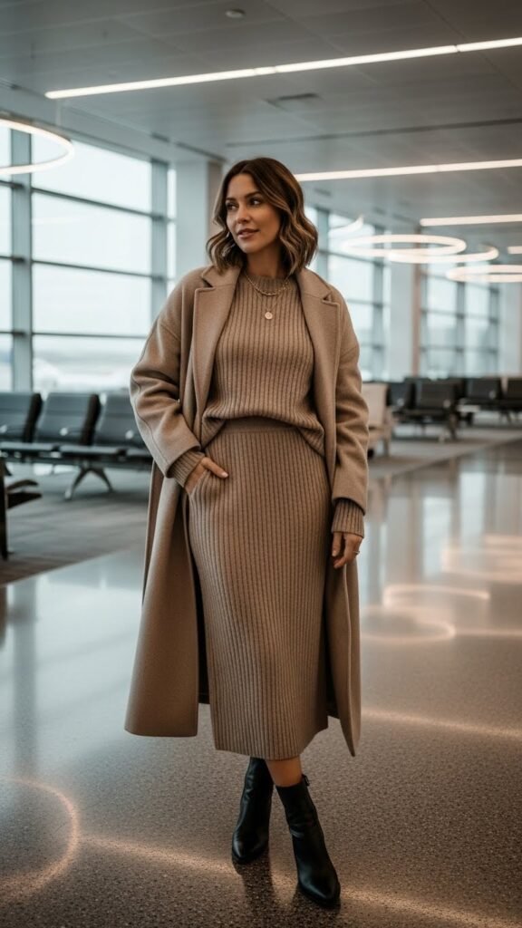 Go full camel or grey from head to toe. Think matching knit pants and sweater in the same neutral shade. The monochrome effect is inherently sleek and makes you look taller, which is a nice bonus when you’re surrounded by your carry-on chaos.