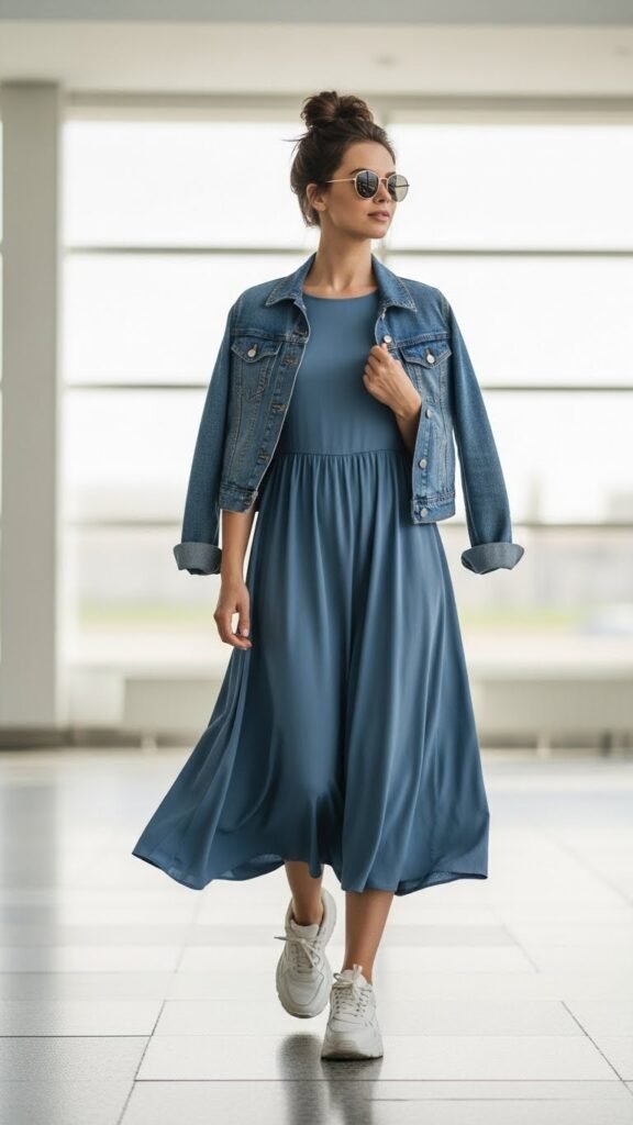 Choose a flowy midi dress in a solid color or subtle print. Nothing too fitted because airplane seats and tight dresses are natural enemies. The chunky white sneakers are non-negotiable here. They balance out the feminine dress and keep things casual and comfortable for all the walking you’ll inevitably do.