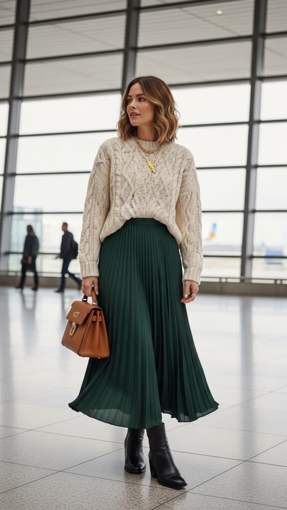 Pointed-toe flats or mules keep this looking sophisticated. Add a long cardigan for layering options and a crossbody bag for practicality. This outfit feels very “I’m flying to a creative meeting in a cool city,” which is exactly the vibe you want even if you’re actually visiting your parents. The movement of wide-leg pants as you walk through the airport? Chef’s kiss.