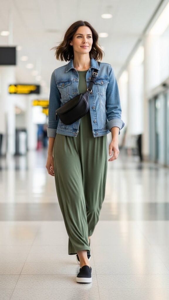 Layer a denim or leather jacket for warmth and style. Slip-on sneakers keep it casual and comfortable, while a belt bag adds a sporty, modern touch. This outfit is perfect for warm-weather destinations or summer travel. You can dress it up with jewelry or keep it simple depending on where you’re headed. Either way, you’ll be comfortable for hours of sitting, which is really what matters most.