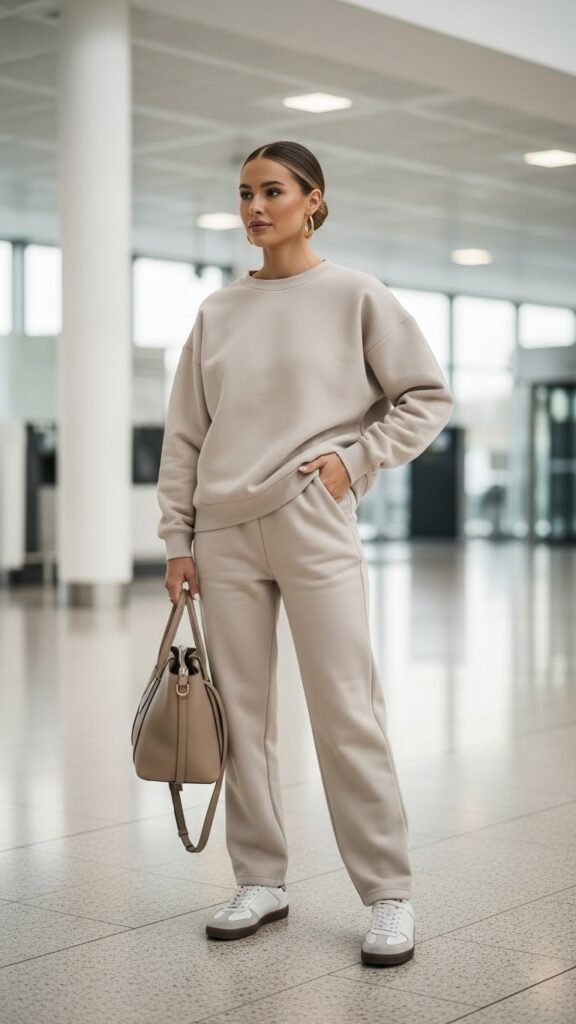 Pick a matching sweat set in a neutral color like cream, sage, or charcoal. The key here is the fit: slightly oversized but not drowning-in-fabric oversized. Pair it with white sneakers and a structured tote bag, and suddenly you look like you’re on your way to a chic wellness retreat instead of gate B47.