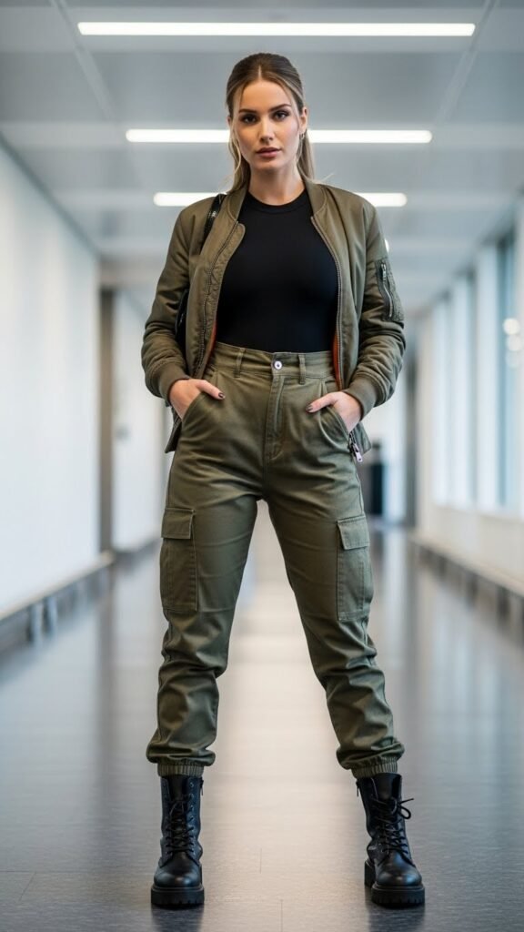 Combat boots lean into the utility aesthetic, or go with sneakers for something softer. Layer a bomber jacket or utility jacket if you need extra warmth. This outfit has serious “I’m going on an adventure” energy, even if that adventure is just finding decent airport food. The pockets alone make it worth it. Phone, passport, snacks, lip balm, all the essentials within reach.