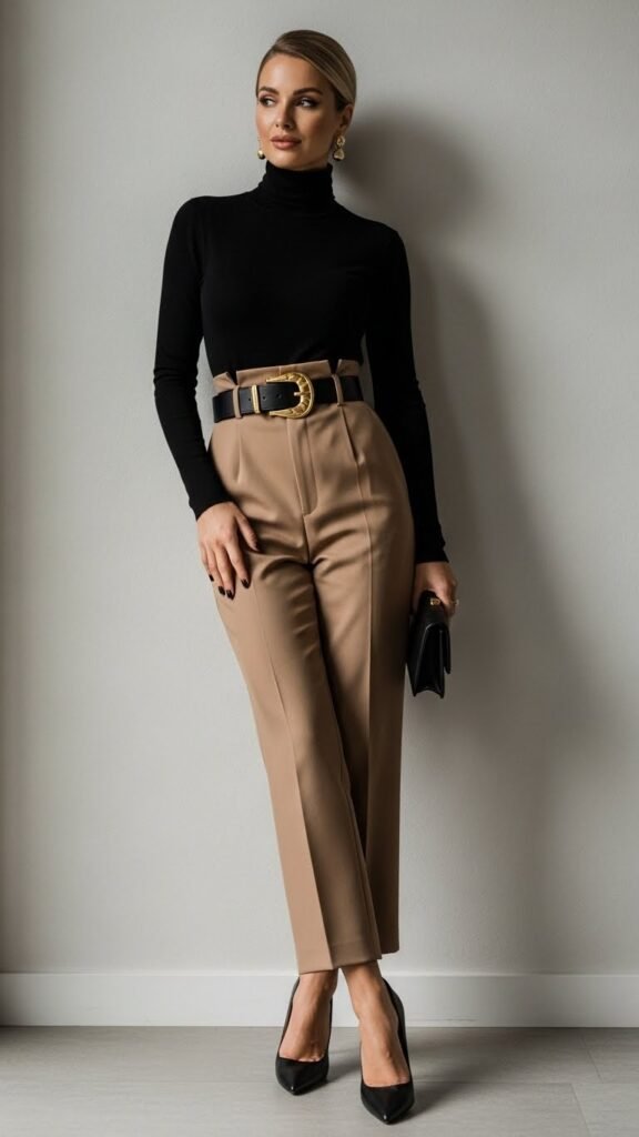 Want to look expensive without trying too hard? This is your outfit. A fitted turtleneck in black, chocolate brown, or forest green paired with high waisted tan trousers creates the most flattering silhouette.