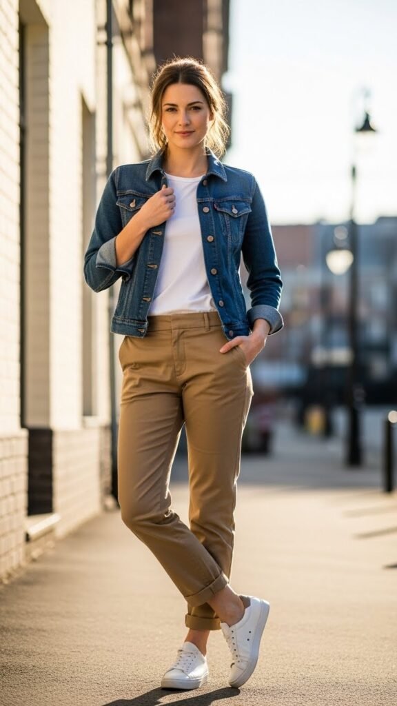 Time to dress those tan trousers down a bit. A classic blue denim jacket thrown over a simple white tee creates this casual, weekend ready look that still feels intentional.