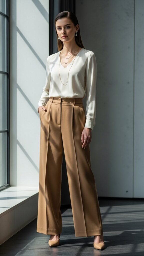 Okay, fancy pants time. A silk blouse in a soft blush, sage, or classic ivory paired with tan trousers is pure elegance. This combination works for date nights, dinners, and any occasion where you want to look absolutely stunning.