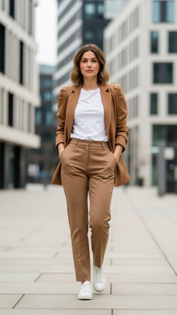 Monochromatic magic coming through. Pairing tan trousers with a matching tan blazer creates a suit look that’s somehow both powerful and relaxed. This tonal approach is incredibly chic and works for so many occasions.