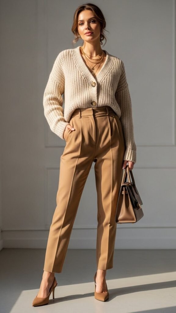 Hear me out on this one. A chunky knit cardigan worn as a top, buttons done up, paired with tan trousers is giving cozy elegance. Add slingback kitten heels, and suddenly you’re the most stylish person in the room.