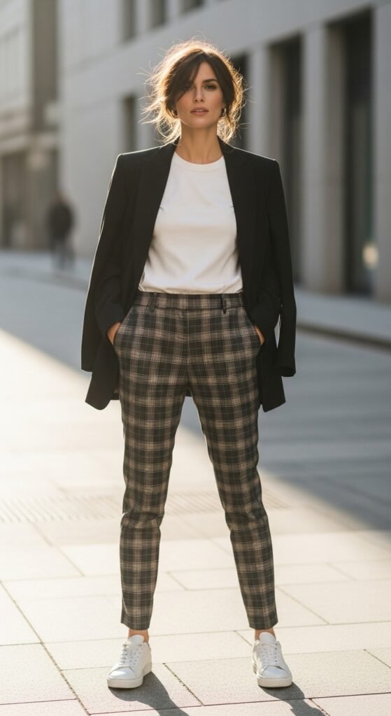 Different from the oversized blazer vibe, this is about sharp, tailored precision. A fitted blazer in a solid color (black, navy, camel) paired with tartan trousers creates a look that’s polished and professional but still has personality.