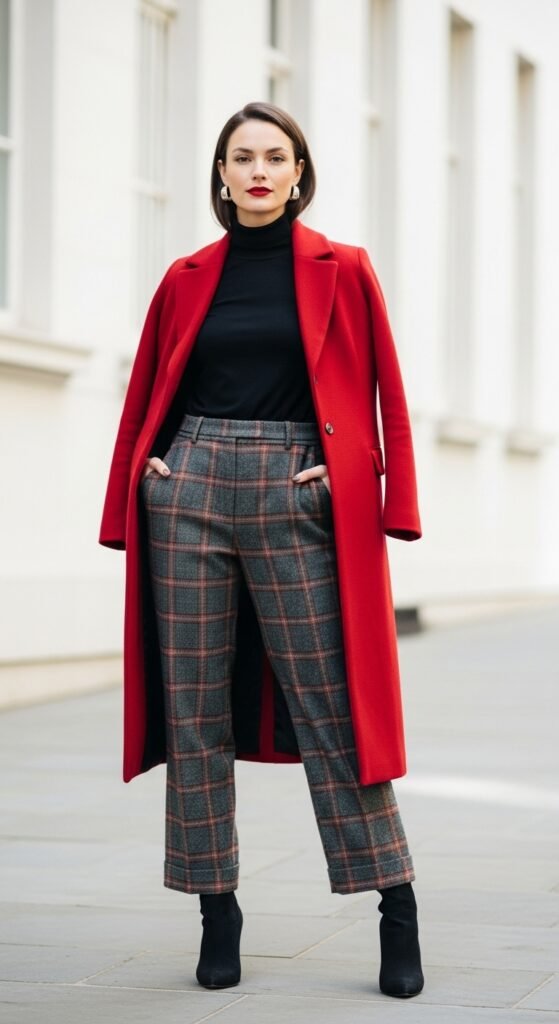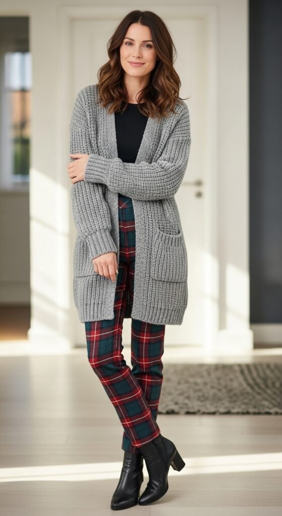 The beauty of this combo is the texture play. You’ve got the softness of the knit against the structured pattern of the tartan, and it just works. Add ankle boots, and suddenly you’re that person everyone wants style advice from.