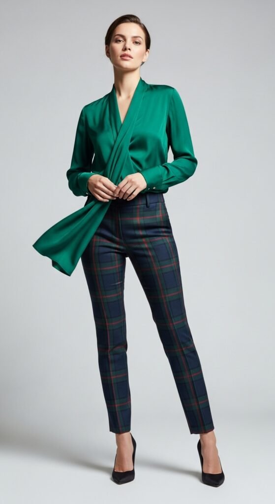 Choose a silk blouse in a complementary color to your tartan. Jewel tones work beautifully here. Emerald green, deep burgundy, rich navy. Tuck it in fully and add a statement belt if you want to define your waist, or do a French tuck for something more relaxed.