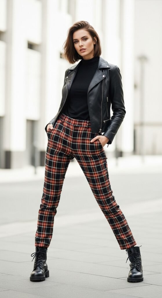 Keep the rest simple with a fitted black turtleneck or even a band tee underneath. The tartan trousers bring the pattern, the leather brings the attitude, and you bring the confidence. Throw on some combat boots or chunky ankle boots, and you’ve got yourself an outfit that could go from coffee to concerts.