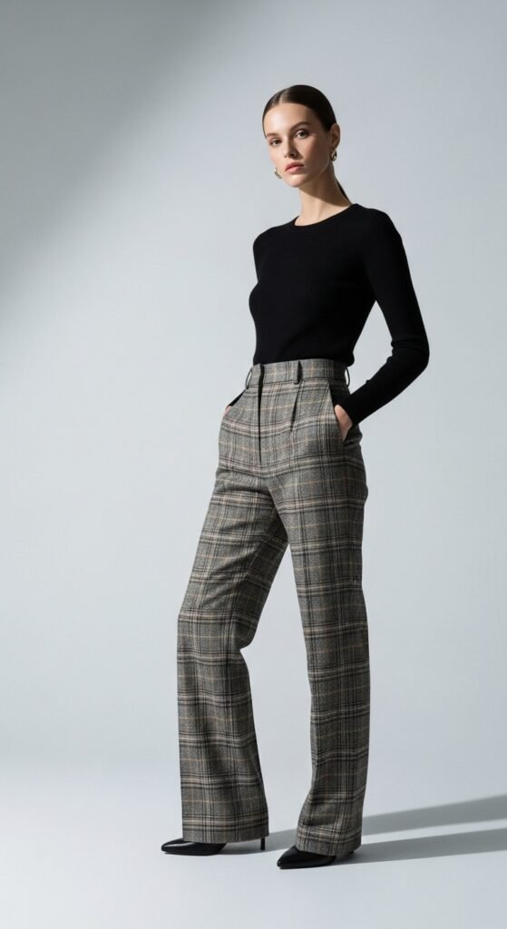 Add heeled ankle boots or pointed-toe pumps, some delicate jewelry, and you’re ready for dinner, drinks, or wherever the night takes you. It’s proof that tartan trousers can absolutely work for dressier occasions when you style them right.