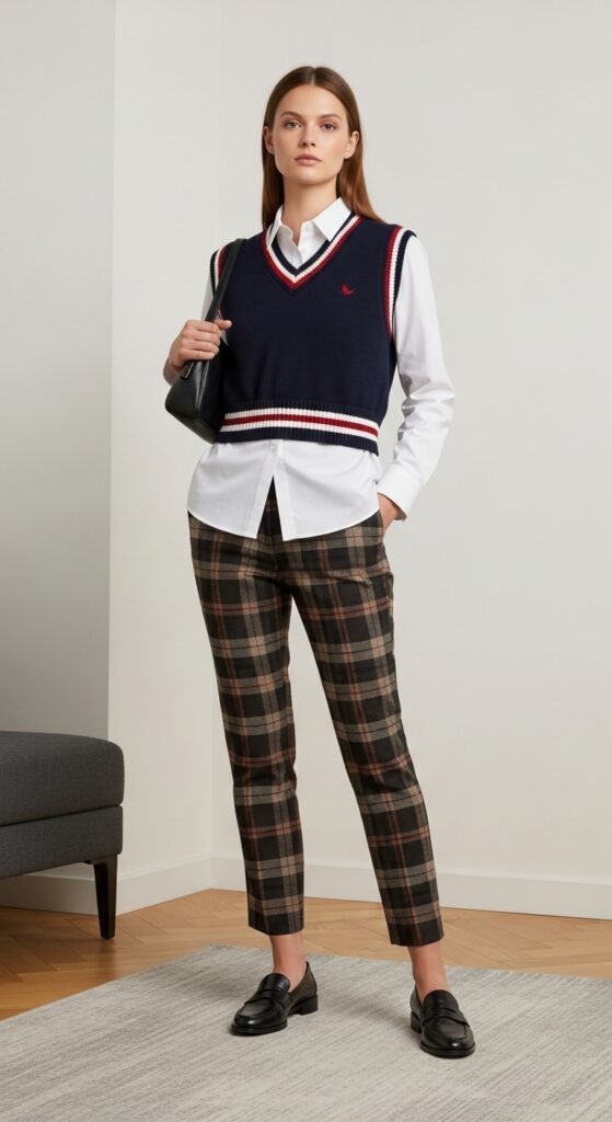 Okay, hear me out because sweater vests are back and they’re actually cool now. Layer a cropped sweater vest over a long-sleeve turtleneck or a crisp button-down, and pair it with your tartan trousers. The proportions are everything here.