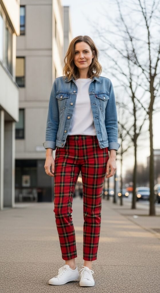 The denim jacket brings a casual, laid-back energy that tones down the preppy nature of tartan. It’s approachable, easy, and honestly kind of genius. Pair with a simple white tee or striped shirt underneath, and you’ve got weekend errands covered.
