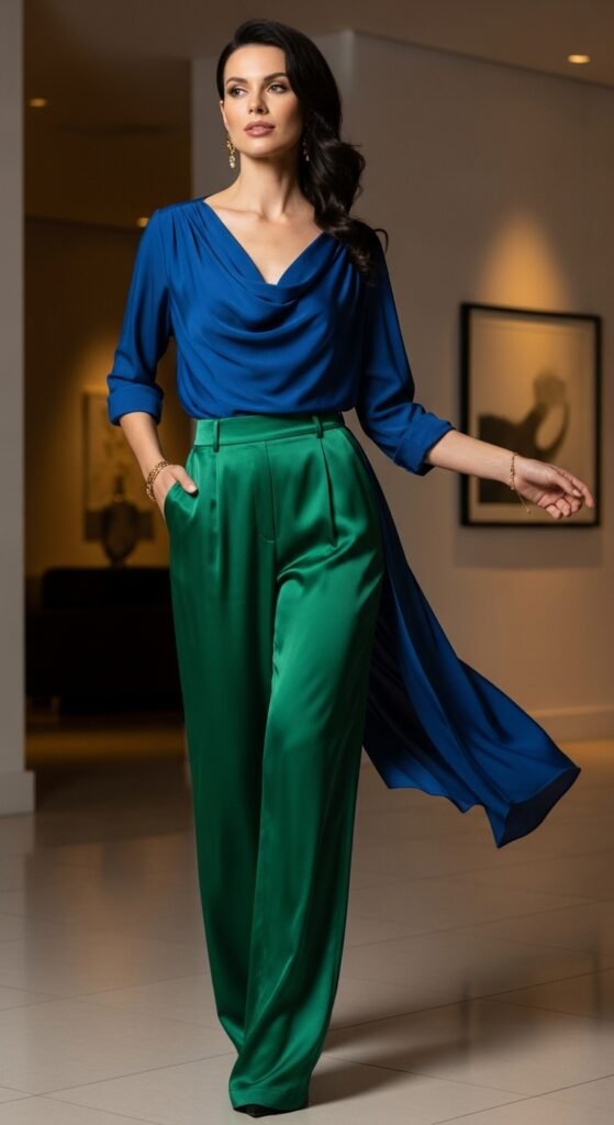 When you want to feel fancy without going full gown, silk trousers with a draped blouse is the answer. This combination is elegant, fluid, and perfect for events where you want to stand out.