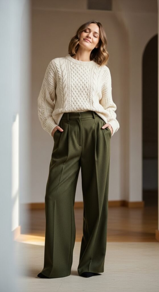 The play here is contrast. Choose a chunky or ribbed knit sweater and tuck it into high waisted pleated trousers for a silhouette that’s equal parts cozy and polished. The pleats add structure while the knit keeps things soft and approachable. I love this with pointed toe boots or even sleek ballet flats if you’re feeling dainty.