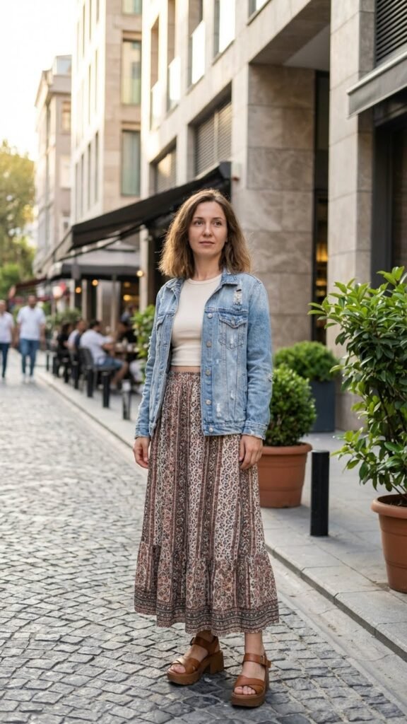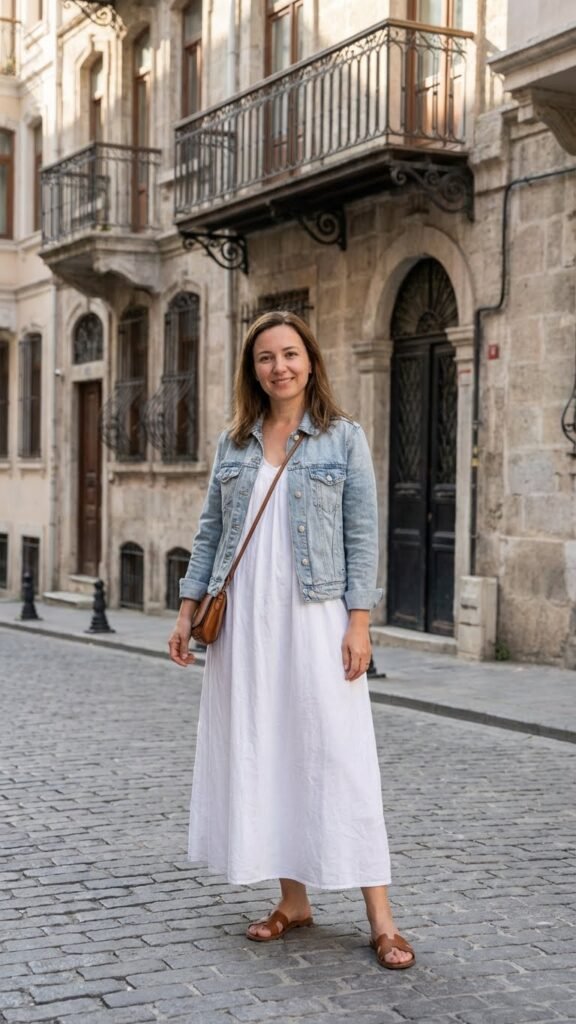 Grab a flowy maxi dress in a breathable fabric like cotton or linen. Pair it with a cropped or regular denim jacket for those cooler mornings or when you’re popping into air-conditioned museums. The jacket adds structure and keeps your shoulders covered when needed. Throw on some comfortable flat sandals or white sneakers and you’re golden.