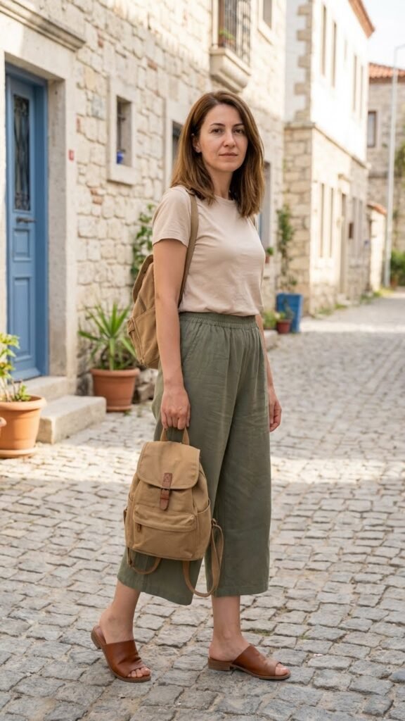 Add mule sandals and you’ve got a look that’s polished but not trying too hard. This outfit screams “I know what I’m doing” even when you’re using Google Translate to order breakfast. A small backpack keeps your essentials close while leaving your hands free.