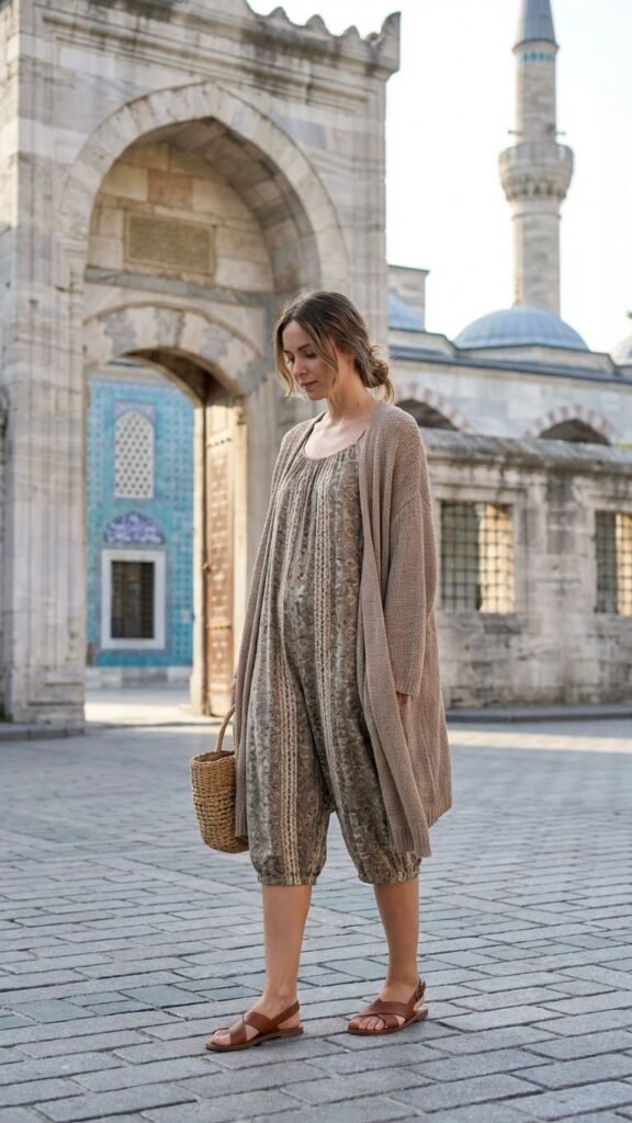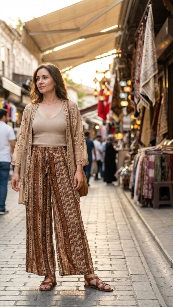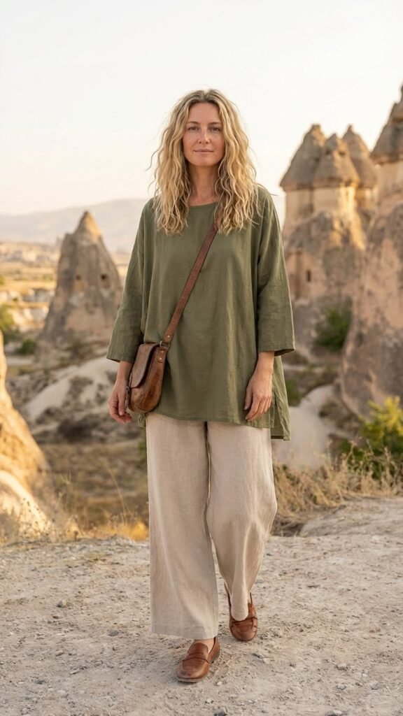 Match them with a loose tunic top that hits around mid-thigh. This silhouette is perfect for Turkey because it’s modest without feeling frumpy. The flowing fabric keeps you cool in the heat, and honestly? You’ll look chic as hell. Go for neutral tones like beige, olive, or soft white for that effortless travel aesthetic.