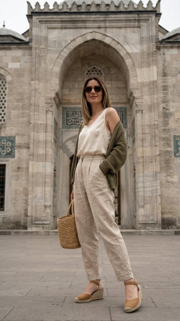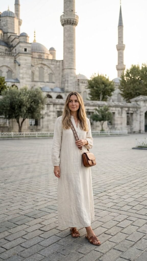 Choose a midi or maxi linen dress with a relaxed fit. Pair it with your favorite white or neutral sneakers. This combination is perfect for those days with tons of walking (hello, Topkapi Palace grounds). The dress keeps you cool and covered, while the sneakers give you the support you actually need.