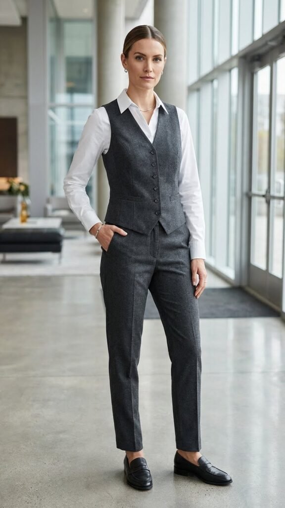 The key here is fit. You want the vest to hug your torso without pulling at the buttons—nobody needs that stress before their first coffee. Pair this with high-waisted trousers in black or navy, and you’ve got yourself a look that works for presentations, client meetings, or just dominating the Monday morning inbox.