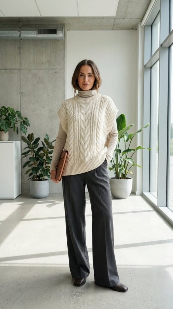 Here’s the thing about oversized knit vests: they shouldn’t work in an office setting, but they absolutely do. The secret is balance. That chunky, cozy texture on top needs something streamlined on the bottom—enter wide-leg trousers.