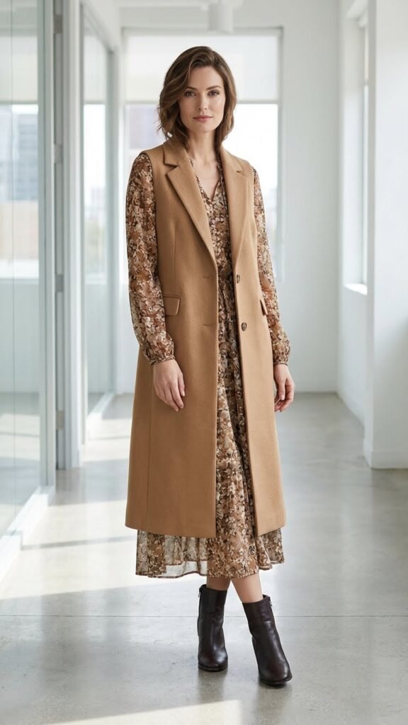 Choose a solid-colored vest—black or camel works beautifully—and pair it with a printed or textured midi dress. The vest essentially acts as a frame, pulling the whole outfit together. Add ankle boots or kitten heels, and you’ve got a look that transitions seamlessly from desk to dinner.