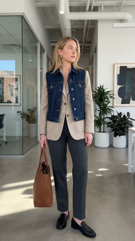 This one’s for the bold style lovers. Layering a structured denim vest over a blazer sounds chaotic, but when done right, it’s incredibly chic. The key is ensuring both pieces are fitted—no oversized chaos here.