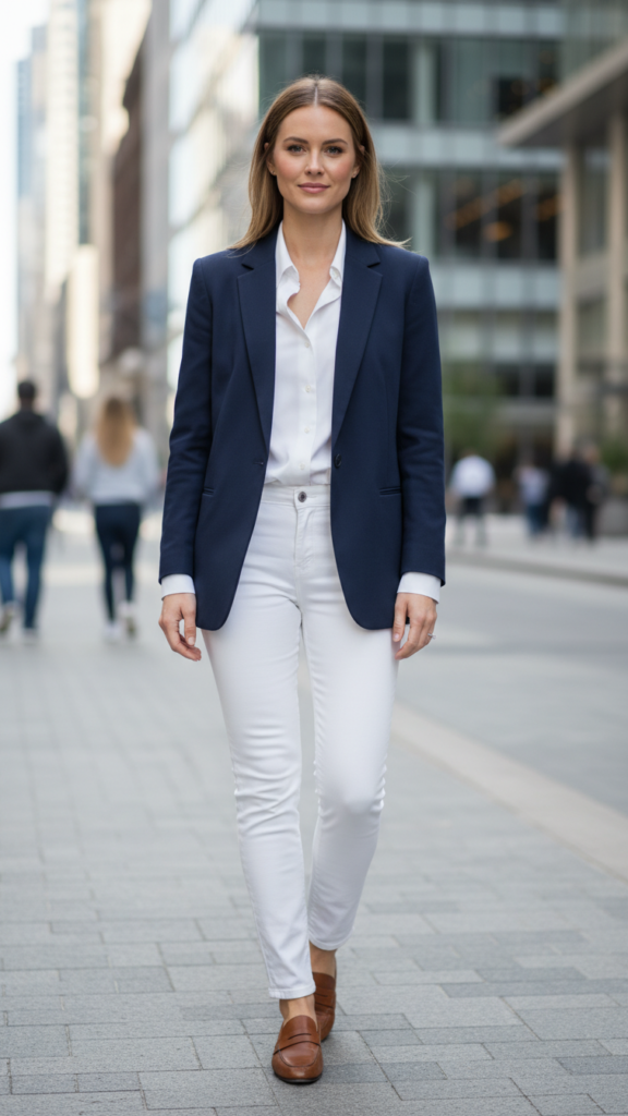 Building off this timeless foundation, the classic navy blazer paired with a crisp white button-down creates an effortlessly polished look that works beautifully with white jeans. You’ll love how this combination gives you professional credibility while maintaining your personal style freedom.